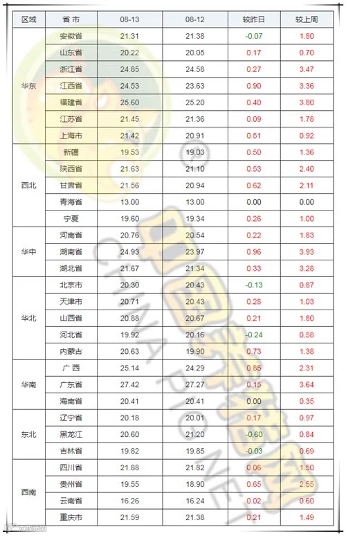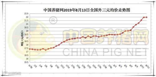 2019年8月13日,据中国养猪网猪价系统监测全国外三元均价为21.96元/公斤,价格较昨日上涨0.01元/公斤,较上周上涨1.96元/公斤。今日猪价涨幅维持在0.02-0.90元/公斤,今日猪价跌幅维持在0.03-0.60元/公斤。