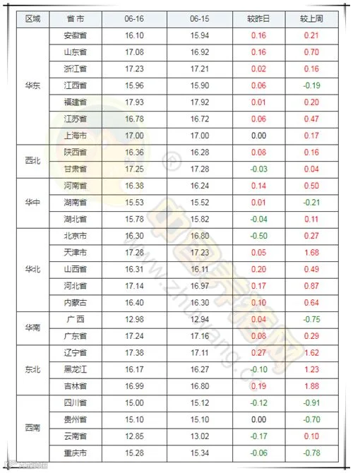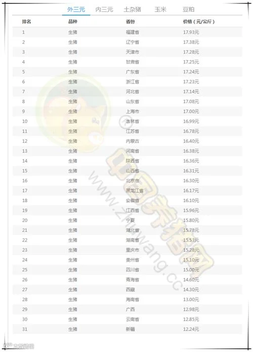 今日最高:福建省外三元均价为17.93元/公斤。今日最低:新疆外三元均价为12.24元/公斤。
