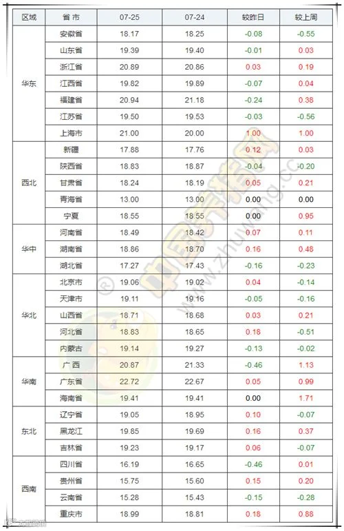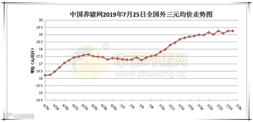 2019年7月25日,据中国养猪网猪价系统监测全国外三元均价为19.21元/公斤,价格较昨日下跌0.04元/公斤,较上周上涨0.22元/公斤。今日猪价涨幅维持在0.03-1.00元/公斤,跌幅维持在0.01-0.46元/公斤。