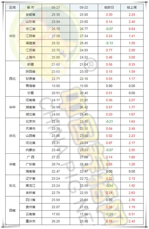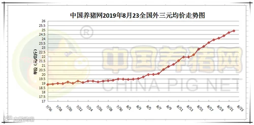 2019年8月23日,据中国养猪网猪价系统监测全国外三元均价为24.90元/公斤,价格较昨日上涨0.20元/公斤,较上周上涨1.75元/公斤。今日猪价涨幅维持在0.02-0.56元/公斤,今日猪价跌幅维持在0.07元/公斤-0.34元/公斤。
