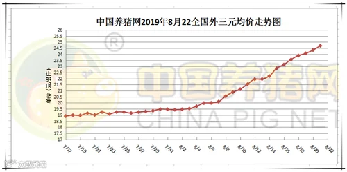 2019年8月22日,据中国养猪网猪价系统监测全国外三元均价为24.70元/公斤,价格较昨日上涨0.15元/公斤,较上周上涨1.86元/公斤。今日猪价涨幅维持在0.03-0.52元/公斤,今日猪价跌幅维持在0.09元/公斤-0.35元/公斤。