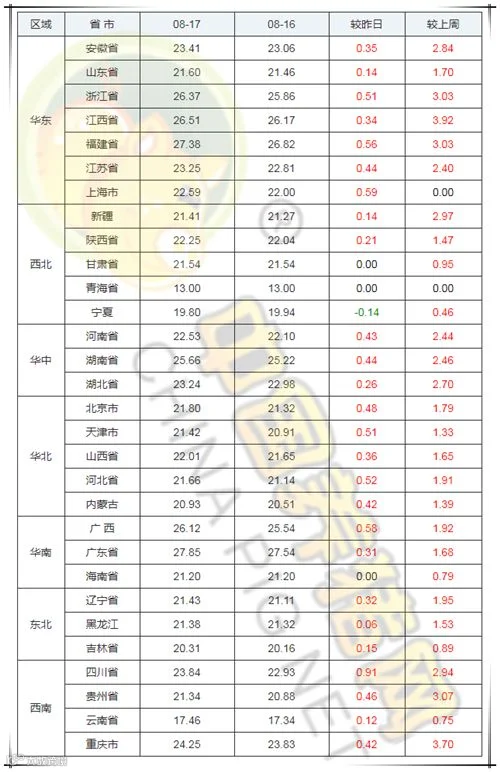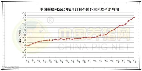 2019年8月17日,据中国养猪网猪价系统监测全国外三元均价为23.57元/公斤,价格较昨日上涨0.42元/公斤,较上周上涨2.44元/公斤。今日猪价涨幅维持在0.06-0.91元/公斤,今日猪价跌幅维持在0.01元/公斤-0.14元/公斤。