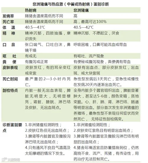 由于持续高温,很多猪场猪出现高烧,不食,皮肤发红,抗生素治疗无效,且立即死亡。很多养殖朋友将此现象诊断为非洲猪瘟将猪恐慌性抛售或扑杀。其实此临床现象与高温导致猪群热射病(中暑)的现象极为相似。下面是热射病与非洲猪瘟的鉴别诊断,供养殖朋友参考并理性对待。