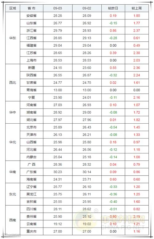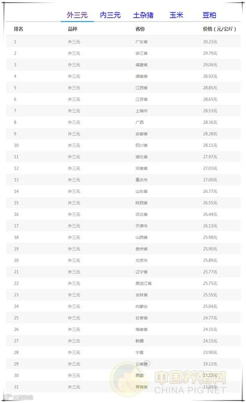 今日最高省份:广东省外三元均价为30.23元/公斤;