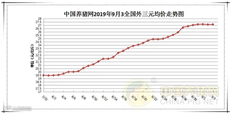 2019年9月3日,据中国养猪网猪价系统监测全国外三元均价为27.13元/公斤,价格较昨日下跌0.01元/公斤,较上周上涨1.18元/公斤。今日猪价涨幅维持在0.02-0.86元/公斤,今日猪价跌幅维持在0.08元/公斤-0.54元/公斤。