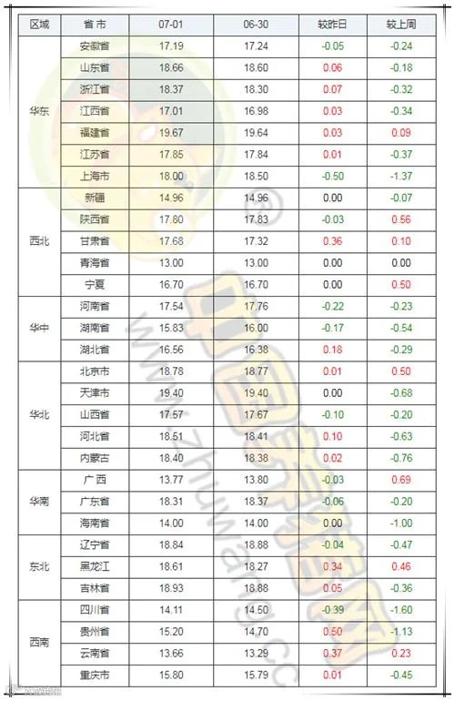 2019年7月1日,据中国养猪网猪价系统监测全国外三元均价为17.35元/公斤,价格较昨日下跌0.03元/公斤,较上周下跌0.23元/公斤。今日猪价涨幅维持在0.01-0.50元/公斤,跌幅维持在0.03-0.50元/公斤。