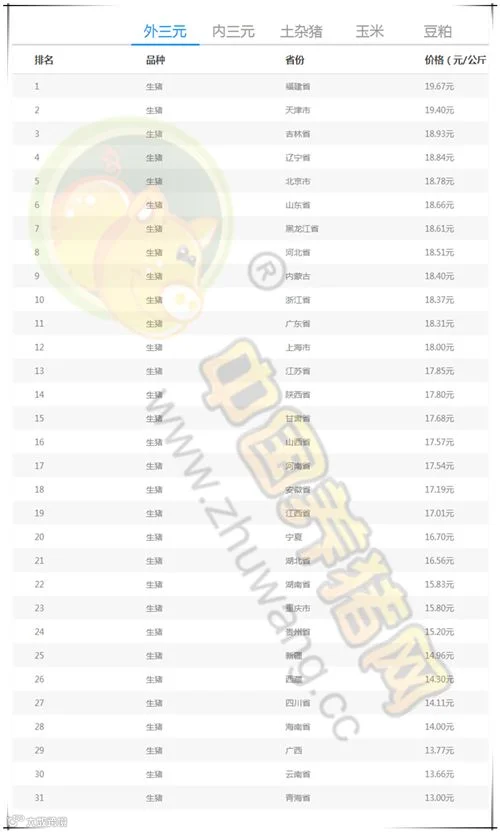 今日最高猪价:福建外三元均价为19.67元/公斤。今日最低猪价:青海外三元均价为13.00/公斤。
