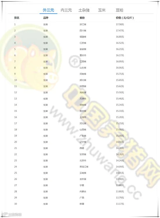 今日最高猪价:浙江生猪外三元均价为17.58元/公斤。今日最低猪价:新疆外三元均价为13.17元/公斤。