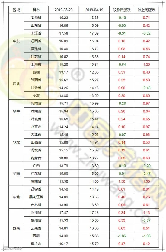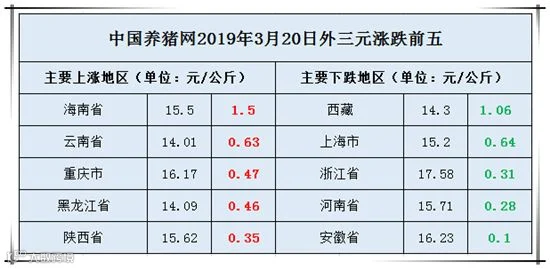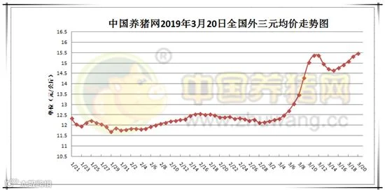 2019年3月21日,据中国养猪网猪价系统监测全国外三元均价为15.46元/公斤,较昨日上涨0.14元/公斤,较上周上涨0.5元/公斤。今日猪价涨幅维持在0.01-0.63元/公斤,跌幅维持在0.01-1.06元/公斤。