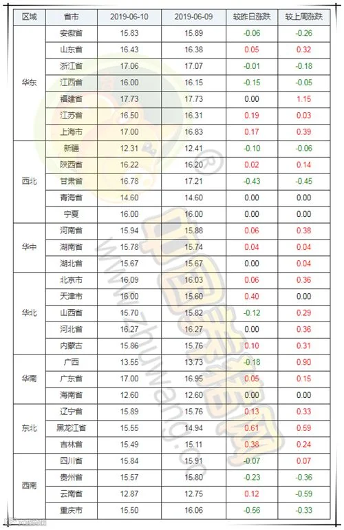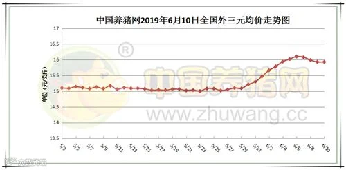 2019年6月10日,据中国养猪网猪价系统监测全国外三元均价为15.93元/公斤,较昨日持平,较上周上涨0.14元/公斤。今日猪价涨幅维持在0.02-0.61元/公斤,跌幅维持在0.01-0.56元/公斤。