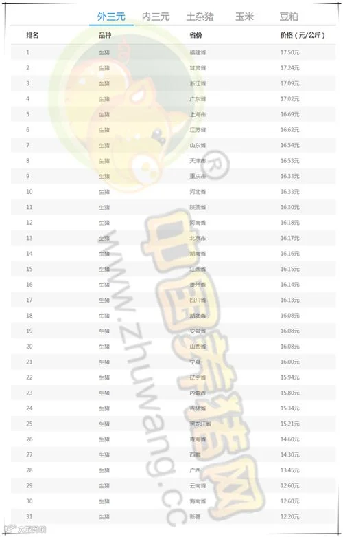 今日最高:福建省外三元均价为17.73元/公斤。今日最低:新疆外三元均价为12.31元/公斤