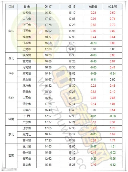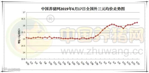 2019年6月17日,据中国养猪网猪价系统监测全国外三元均价为16.23元/公斤,价格较昨日上涨0.03元/公斤,较上周上涨0.30元/公斤。今日猪价涨幅维持在0.05-0.82元/公斤,跌幅维持在0.01-0.47元/公斤。