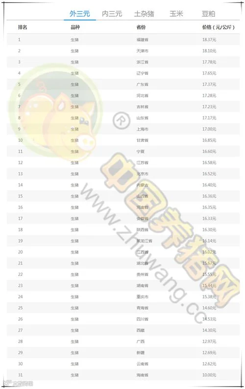 今日最高猪价:福建省外三元均价为18.37元/公斤。今日最低猪价:海南外三元均价为10.00元/公斤。