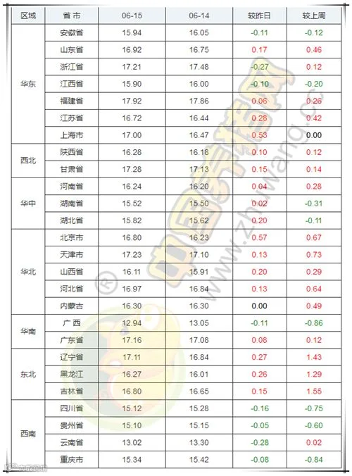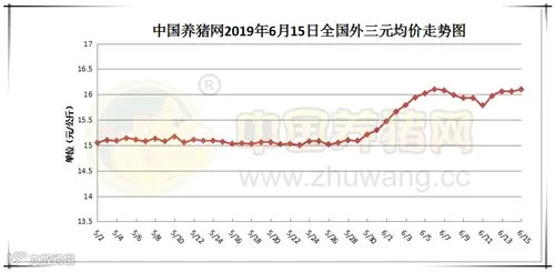 2019年6月15日,据中国养猪网猪价系统监测全国外三元均价为16.10元/公斤,价格较昨日上涨0.04,较上周上涨0.11元/公斤。今日猪价涨幅维持在0.02-0.57元/公斤,跌幅维持在0.05-0.28元/公斤。