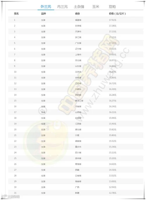 今日最高猪价:福建省外三元均价为17.92元/公斤。今日最低猪价:新疆外三元均价为12.78元/公斤。