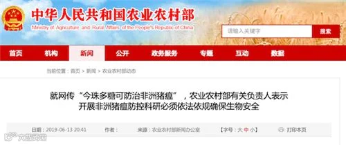 农业农村部官网讯,近日,网络传播所谓“今珠多糖可以防治非洲猪瘟”,引起社会各界高度关注。农业农村部对此高度重视,有关司局及时责成海南省农业农村厅迅速调查核实相关情况,如存在违法违规行为,要迅速依法查处。6月12日下午,媒体报道“海南省农业农村厅发布海南南药研究团队有关研究进展情况”后,农业农村部多次与海南省农业农村厅取得联系,督促其尽快调查核实并报告相关情况。