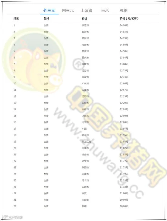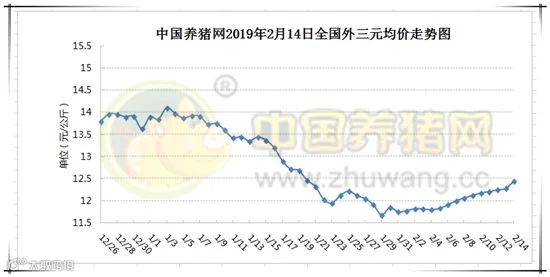 2019年2月14日,据中国养猪网猪价系统监测全国外三元均价为12.45元/公斤,较昨日上涨0.17元/公斤,较上周上涨0.45元/公斤,涨幅维持在0.01-1.00元/公斤,跌幅维持在0.02-0.65元/公斤。