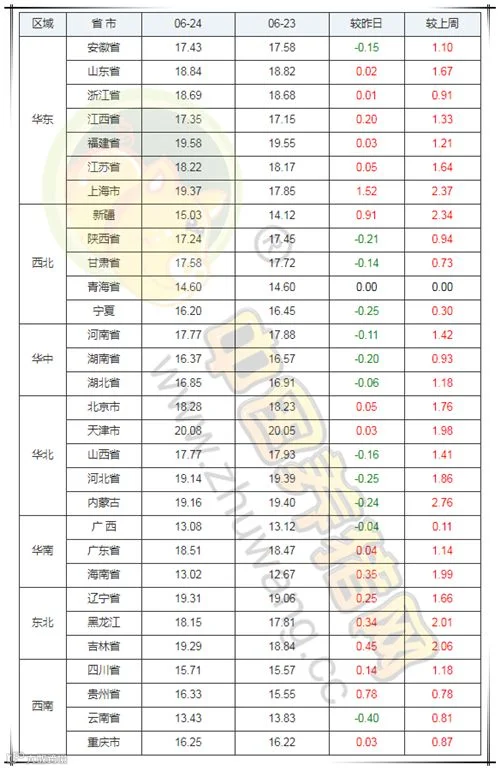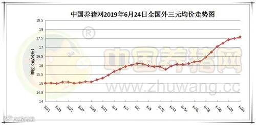 2019年6月24日,据中国养猪网猪价系统监测全国外三元均价为17.58元/公斤,价格较昨日上涨0.09元/公斤,较上周上涨1.35元/公斤。今日猪价涨幅维持在0.01-1.52元/公斤,跌幅维持在0.04-0.40元/公斤。