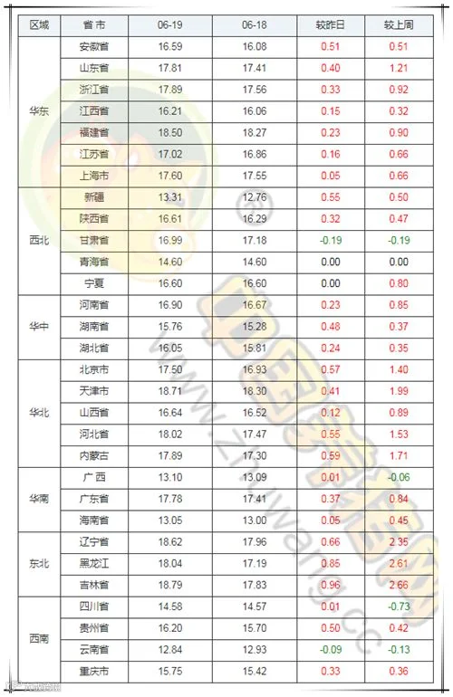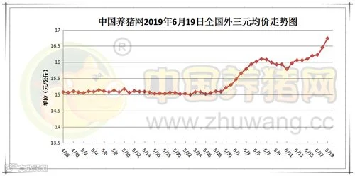 2019年6月19日,据中国养猪网猪价系统监测全国外三元均价为16.74元/公斤,价格较昨日上涨0.28元/公斤,较上周上涨0.77元/公斤。今日猪价涨幅维持在0.01-0.96元/公斤,跌幅维持在0.09-0.19元/公斤。