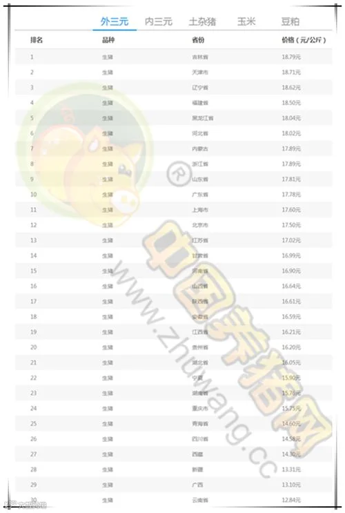 今日最高猪价:吉林外三元均价为18.79元/公斤。今日最低猪价:海南外三元均价为10.32元/公斤。