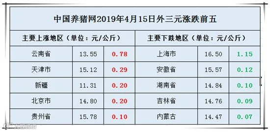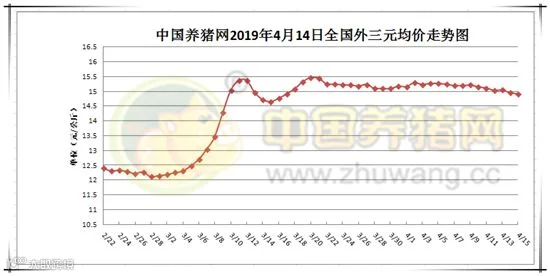 2019年4月15日,据中国养猪网猪价系统监测全国外三元均价为14.91元/公斤,较昨日下跌0.04元/公斤,较上周下跌0.28元/公斤。今日猪价涨幅维持在0.02-0.78元/公斤,跌幅维持在0.01-1.15元/公斤。