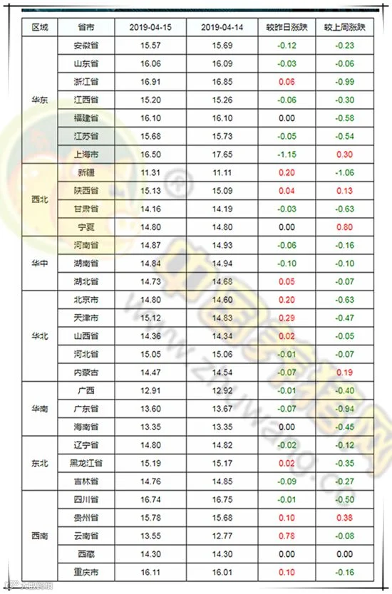 纵观全国,今日下跌地区较多,上涨地区较少,其中浙江、新疆、陕西、湖北、北京、天津、山西、黑龙江、贵州、云南、重庆上涨,其余各省市均出现一定幅度的下跌或持平。