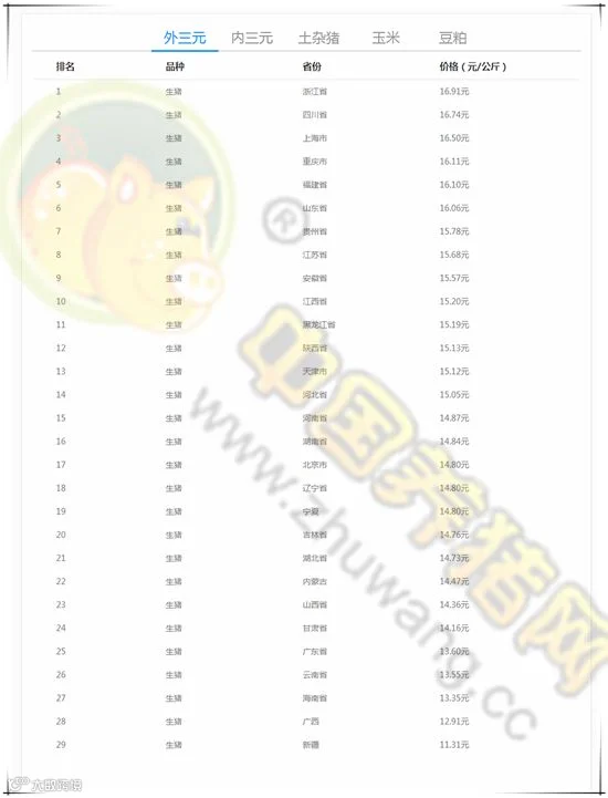 今日最高猪价:浙江省外三元均价为16.91元/公斤。今日最低猪价:新疆外三元均价为11.31元/公斤。