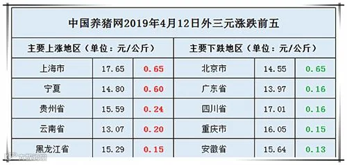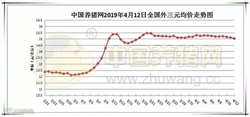 2019年4月13日,据中国养猪网猪价系统监测全国外三元均价为15.03元/公斤,较昨日下跌0.08元/公斤,较上周下跌0.23元/公斤。今日猪价涨幅维持在0.03-0.65元/公斤,跌幅维持在0.01-0.65元/公斤。