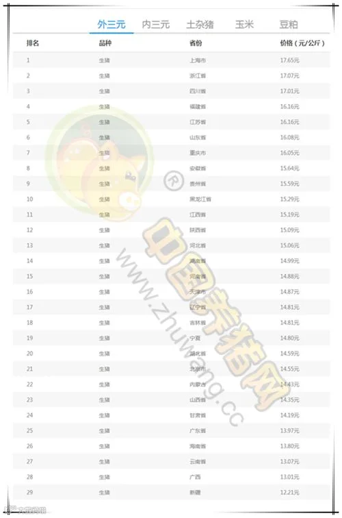 今日最高猪价:上海市外三元均价为17.65元/公斤。今日最低猪价:新疆外三元均价为12.21元/公斤。