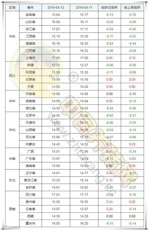 纵观全国,今日下跌地区较多,上涨地区较少,其中上海、甘肃、宁夏、湖南、内蒙古、广西、辽宁、黑龙江、贵州、云南上涨,其余各省市均出现一定幅度的下跌或持平。