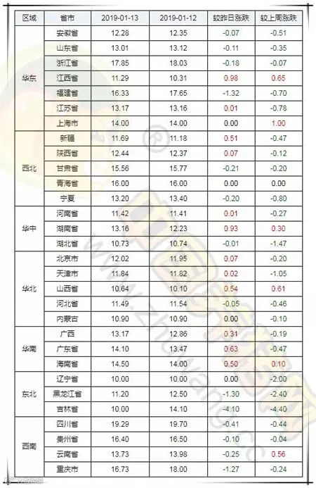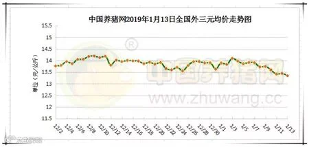 2019年1月12日,据中国养猪网猪价系统监测全国外三元均价为13.35元/公斤,较昨日下跌0.10元/公斤,较上周下跌0.57元/公斤,涨幅维持在0.01-0.98元/公斤,跌幅维持在0.01-4.10元/公斤。