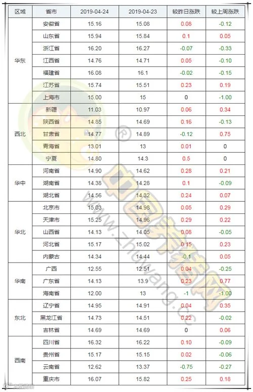 纵观全国,今日上涨地区较下跌地区明显增多,其中浙江、福建、甘肃、内蒙古、海南、云南下跌,其余各省市均出现一定幅度的上涨或持平。