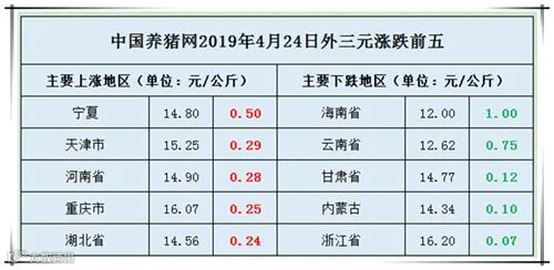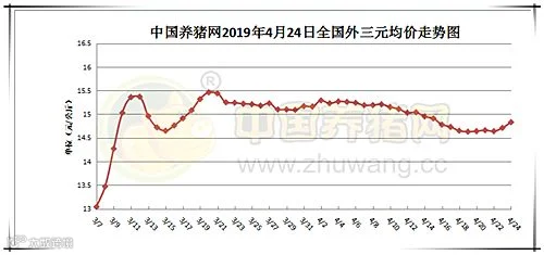 2019年4月24日,据中国养猪网猪价系统监测全国外三元均价为14.83元/公斤,较昨日上涨0.12元/公斤,较上周上涨0.10元/公斤。今日猪价涨幅维持在0.01-0.50元/公斤,跌幅维持在0.02-1.00元/公斤。
