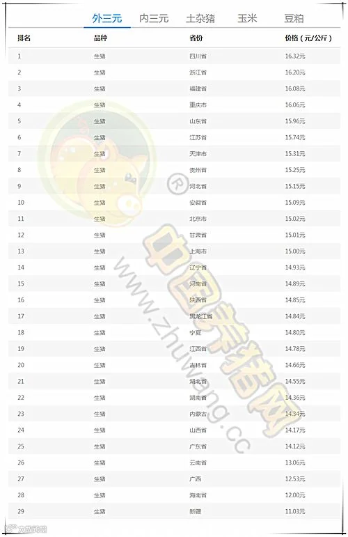 今日最高猪价:四川省外三元均价为16.32元/公斤。今日最低猪价:新疆外三元均价为11.03元/公斤。