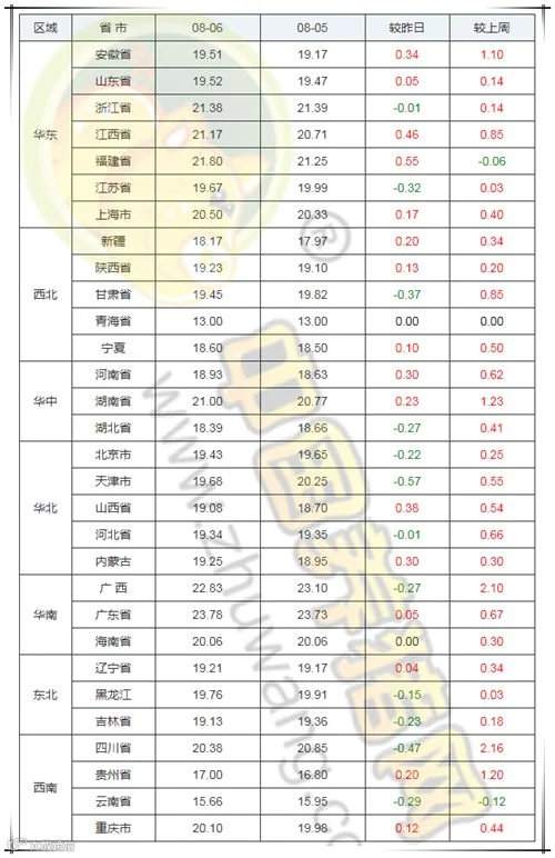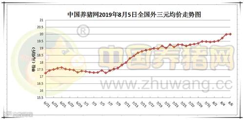 2019年8月6日,据中国养猪网猪价系统监测全国外三元均价为20.00元/公斤,价格较昨日上涨0.02元/公斤,较上周上涨0.52元/公斤。今日猪价涨幅维持在0.04-0.55元/公斤,跌幅维持在0.01-0.57元/公斤。