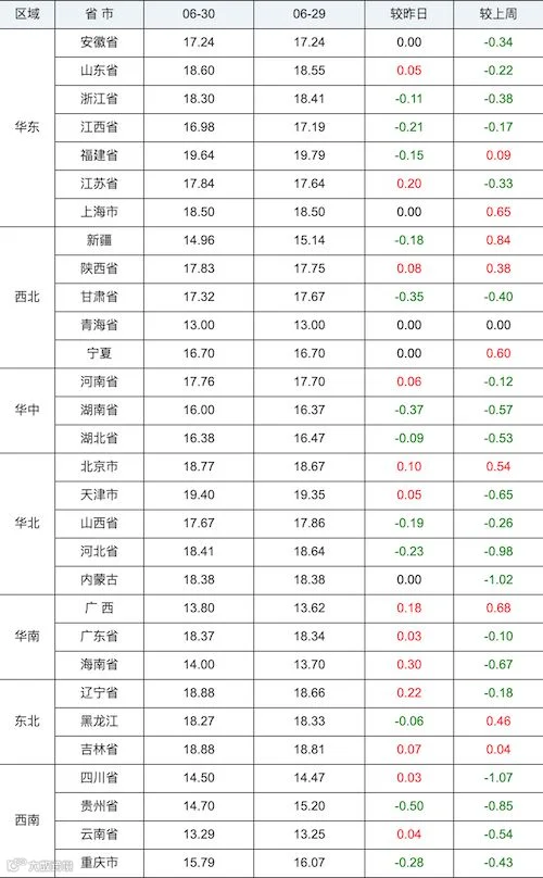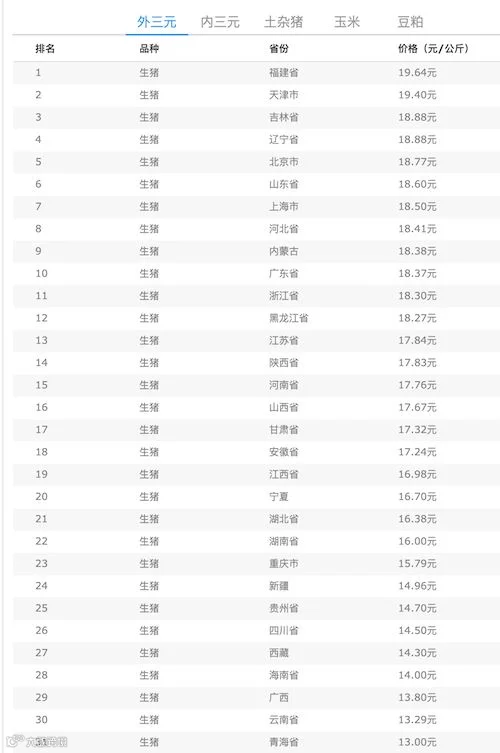 今日最高:福建省外三元均价为19.64元/公斤。今日最低:青海省外三元均价为13.00元/公斤。