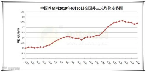 2019年6月30日,据中国养猪网猪价系统监测全国外三元均价为17.38元/公斤,价格较昨日上涨0.09元/公斤,较上周下跌0.11元/公斤。今日猪价涨幅维持在0.03-0.30元/公斤,跌幅维持在0.06-0.50元/公斤。