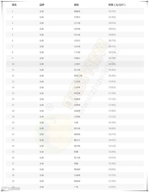 今日最高猪价:天津外三元均价为19.75元/公斤。今日最低猪价:云南省外三元均价为13.45/公斤。