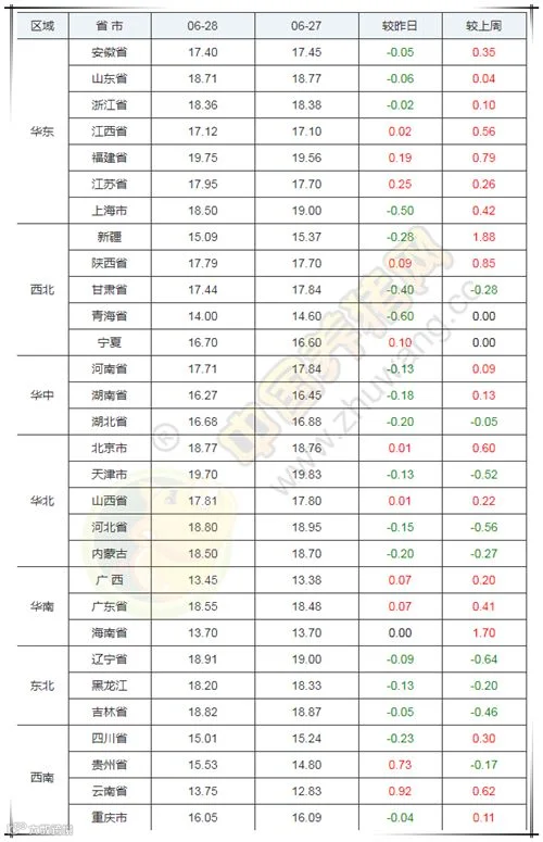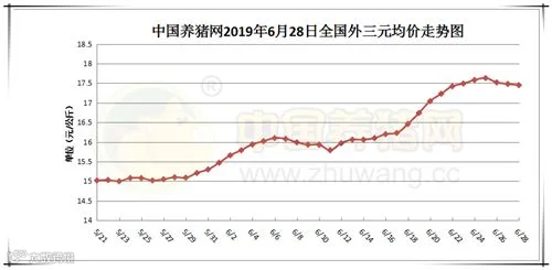 2019年6月28日,据中国养猪网猪价系统监测全国外三元均价为17.43元/公斤,价格较昨日下跌0.05元/公斤,较上周上涨0.20元/公斤。今日猪价涨幅维持在0.01-0.92元/公斤,跌幅维持在0.02-0.60元/公斤。