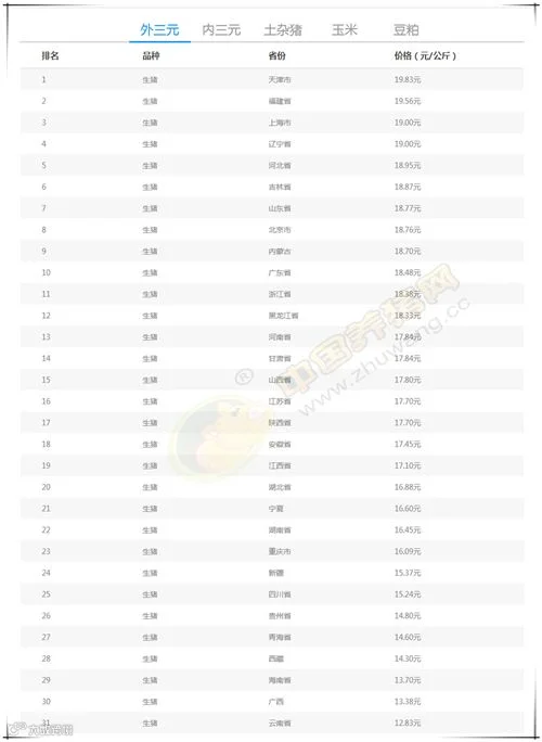 今日最高猪价:天津外三元均价为19.83元/公斤。今日最低猪价:云南省外三元均价为12.83/公斤。