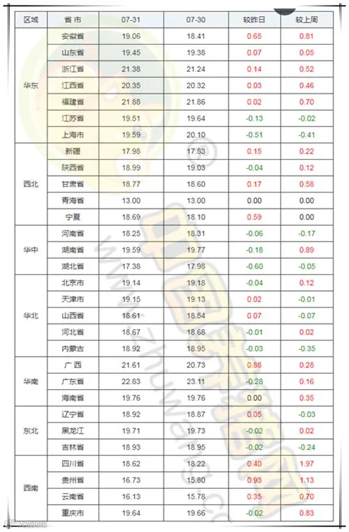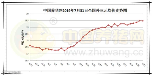 2019年7月31日,据中国养猪网猪价系统监测全国外三元均价为19.47元/公斤,价格较昨日下跌0.01元/公斤,较上周上涨0.22元/公斤。今日猪价涨幅维持在0.02-0.93元/公斤,跌幅维持在0.02-0.60元/公斤。