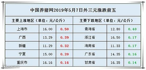 2019年5月7日,据中国养猪网猪价系统监测全国外三元均价为15.08元/公斤,较昨日下跌0.03元/公斤,较上周下跌0.09。今日猪价涨幅维持在0.02-0.50元/公斤,跌幅维持在0.01-0.40元/公斤。