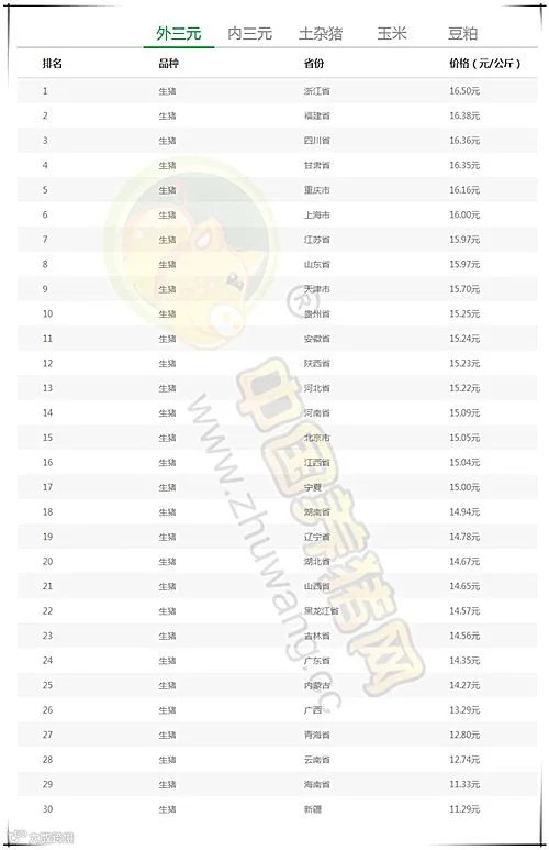 今日最高猪价:浙江省外三元均价为16.67元/公斤。今日最低猪价:新疆外三元均价为10.97元/公斤。