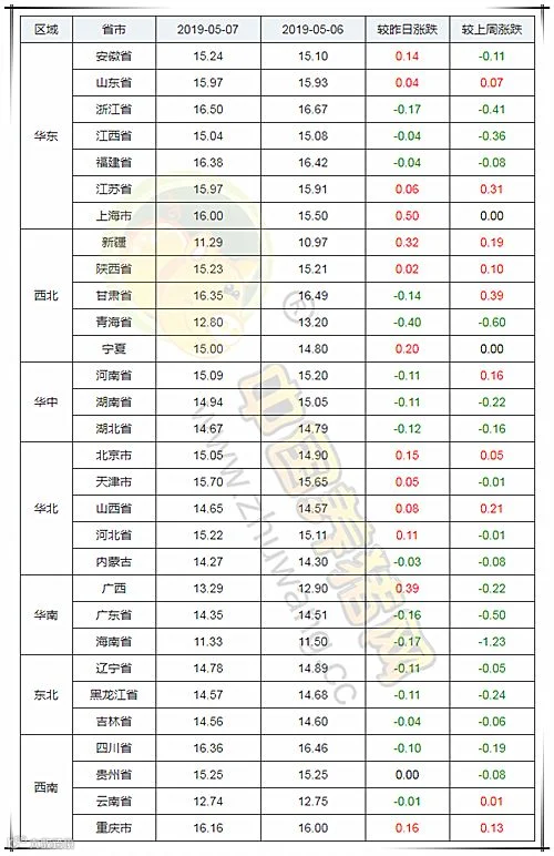 纵观全国,今日全国上涨地区较昨日增多,但下跌地区还是占主导。其中安徽、山东、江苏、上海、新疆、陕西、宁夏、北京、天津、山西、河北、广西、重庆上涨,其余各省市均出现一定幅度的下跌或持平。