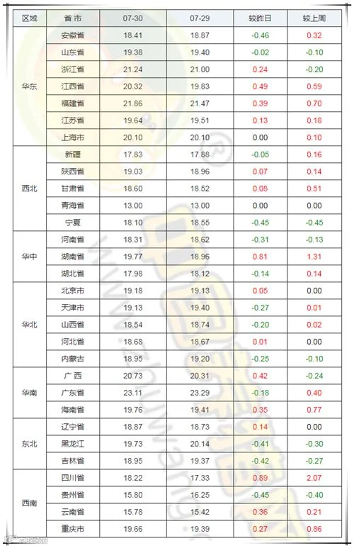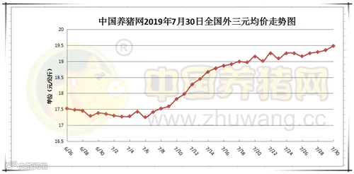 2019年7月30日,据中国养猪网猪价系统监测全国外三元均价为19.48元/公斤,价格较昨日上涨0.13元/公斤,较上周上涨0.39元/公斤。今日猪价涨幅维持在0.01-0.89元/公斤,跌幅维持在0.02-0.46元/公斤。