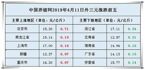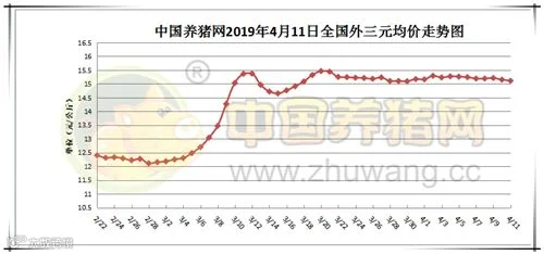 2019年4月11日,据中国养猪网猪价系统监测全国外三元均价为15.11元/公斤,较昨日下跌0.04元/公斤,较上周下跌0.16元/公斤。今日猪价涨幅维持在0.04-0.71元/公斤,跌幅维持在0.01-0.24元/公斤。