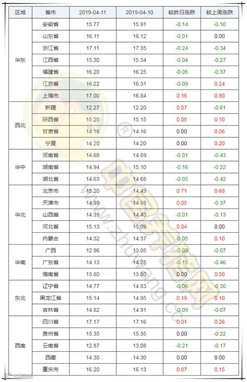 纵观全国,今日下跌地区较多,上涨地区较少,其中上海、新疆、陕西、北京、天津、河北、黑龙江、四川、重庆上涨,其余各省市均出现一定幅度的下跌或持平。
