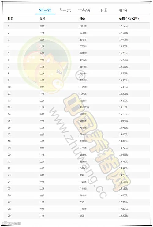 今日最高猪价:四川省外三元均价为17.17元/公斤。今日最低猪价:新疆外三元均价为12.27元/公斤。