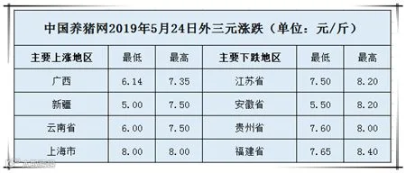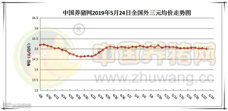 2019年5月24日,据中国养猪网猪价系统监测全国外三元均价为15.08元/公斤,较昨日上涨0.08元/公斤,较上周上涨0.04元/公斤。今日猪价涨幅维持在0.01-0.53元/公斤,跌幅维持在0.01-0.24元/公斤。