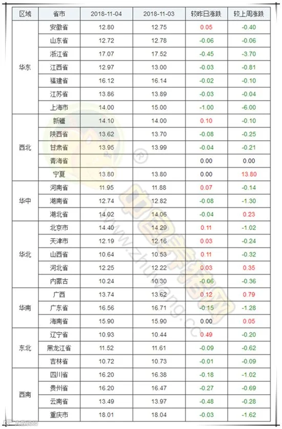 2018年11月04日,据中国养猪网猪价系统监测全国外三元均价为13.65元/公斤,较昨日下跌0.14元/公斤,较上周下跌0.49元/公斤,涨幅维持在0.03-0.49元/公斤,跌幅维持在0.01-1.00元/公斤。安徽、新疆、河南、北京、天津、山西、河北、广西、辽宁等省份上涨,其余省份下跌或持平。